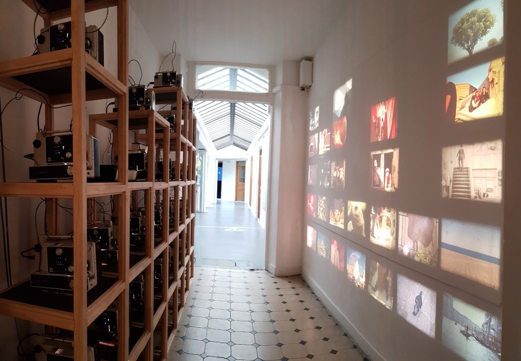 Voisinage présente un jeu de scénettes agencées comme les habitats d’une ville imaginaire, un face à face entre des tours de projecteurs et des tours d’images projetées.